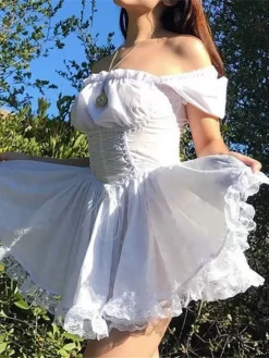 Women Summer Dress Puff Short Sleeve Square Neck Corset Tie-up A-line Dress Y2K Aesthetic Vintage Lolita Dresses Female