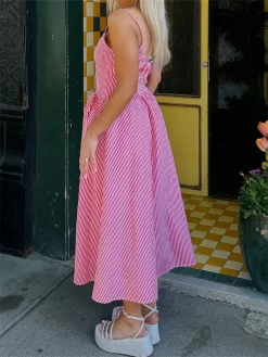 Women’s Bow Long Dress Summer Sleeveless Spaghetti Strap Stripes/Dots Print Dress Flowy Dress