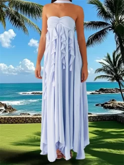 Women Summer Long Dress Solid Color Ruffle Tassel Sleeveless Backless Pleated Dress for Party Club Holiday