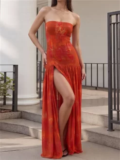 Women Strapless Dress Summer Floral Print High Split Backless Long Dress for Cocktail Party Beach Streetwear