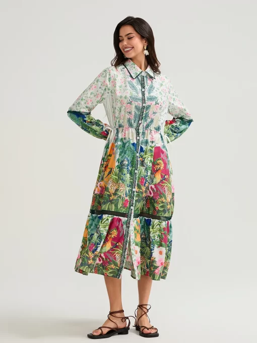 Women Print Long Dress Smocked Waist Button V Neck Short Sleeve Ruffle Hem Flowy Dresses Summer Holiday Casual Loose Dresses