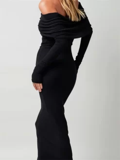 Women’s Long Fitted Evening Dress Black Long Sleeve Off Shoulder Strapless Party Dress