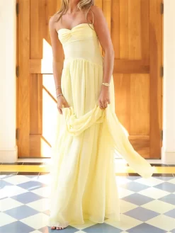 Women Long Dress Solid Color Tube Dress Summer Fashion Backless Casual Strapless Dress with Choker Scarf