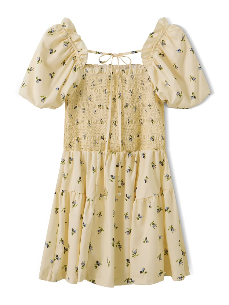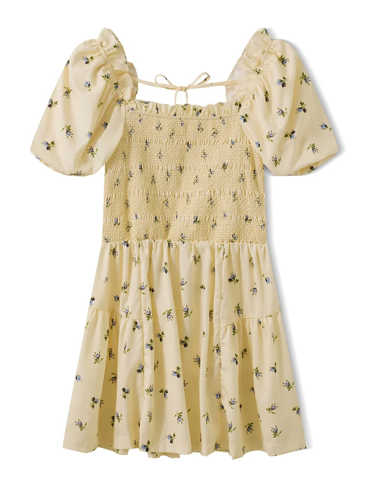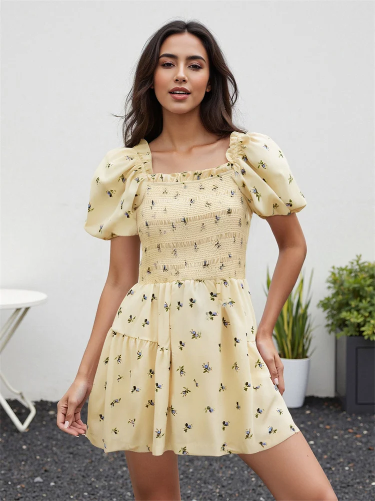 Women Mini A-Line Dress Casual Summer Floral Print/Contrast Color Square Neck Puff Sleeve Party Dress for Streetwear