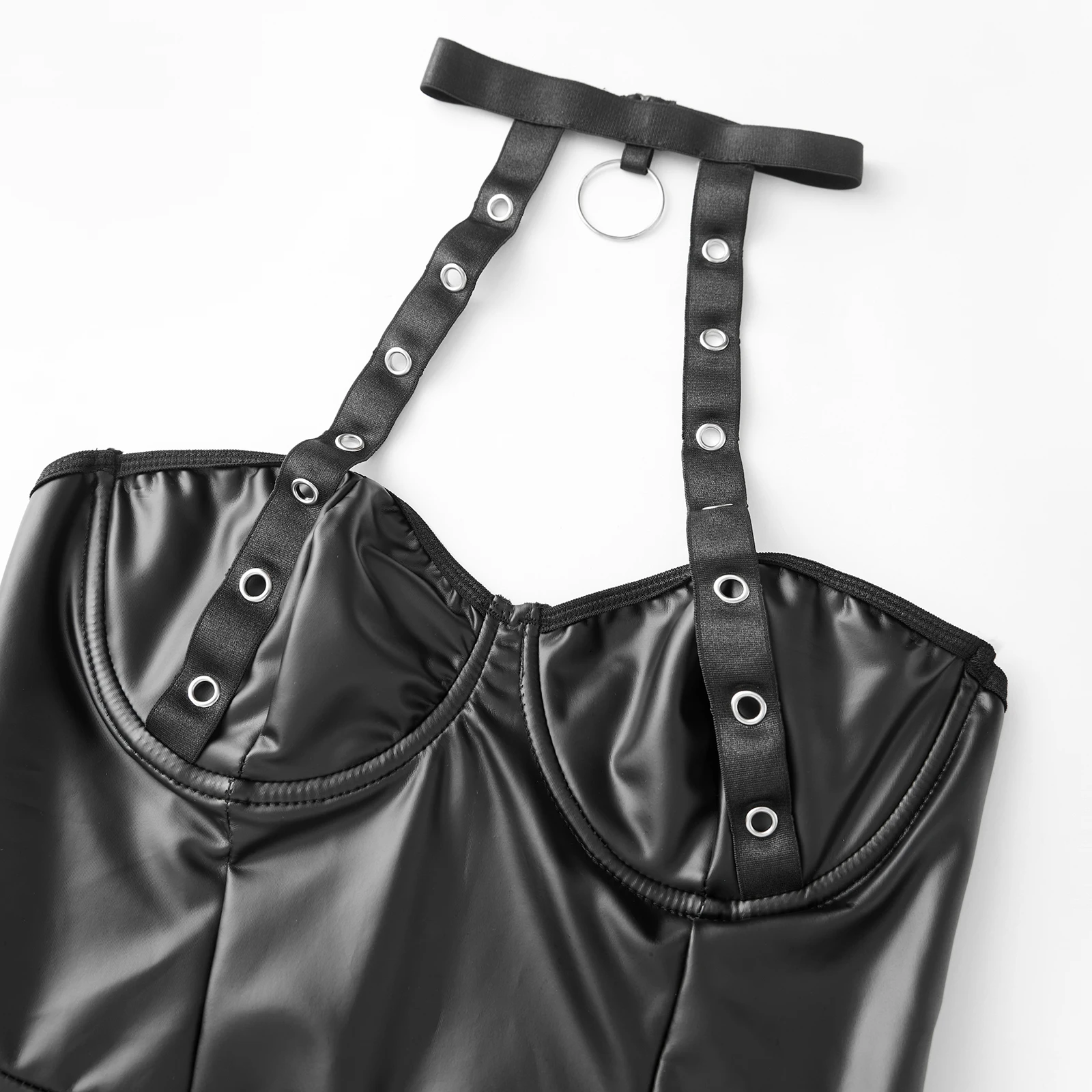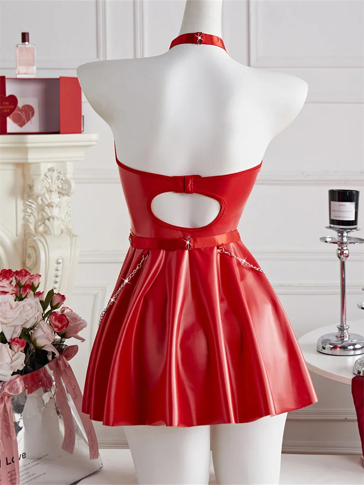 Women’s Lingerie Set Cutout Metal Ring Chain Halter Neck Mini Babydoll Leather Dress with Thong 2 Pcs Set